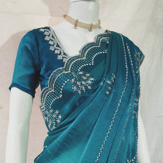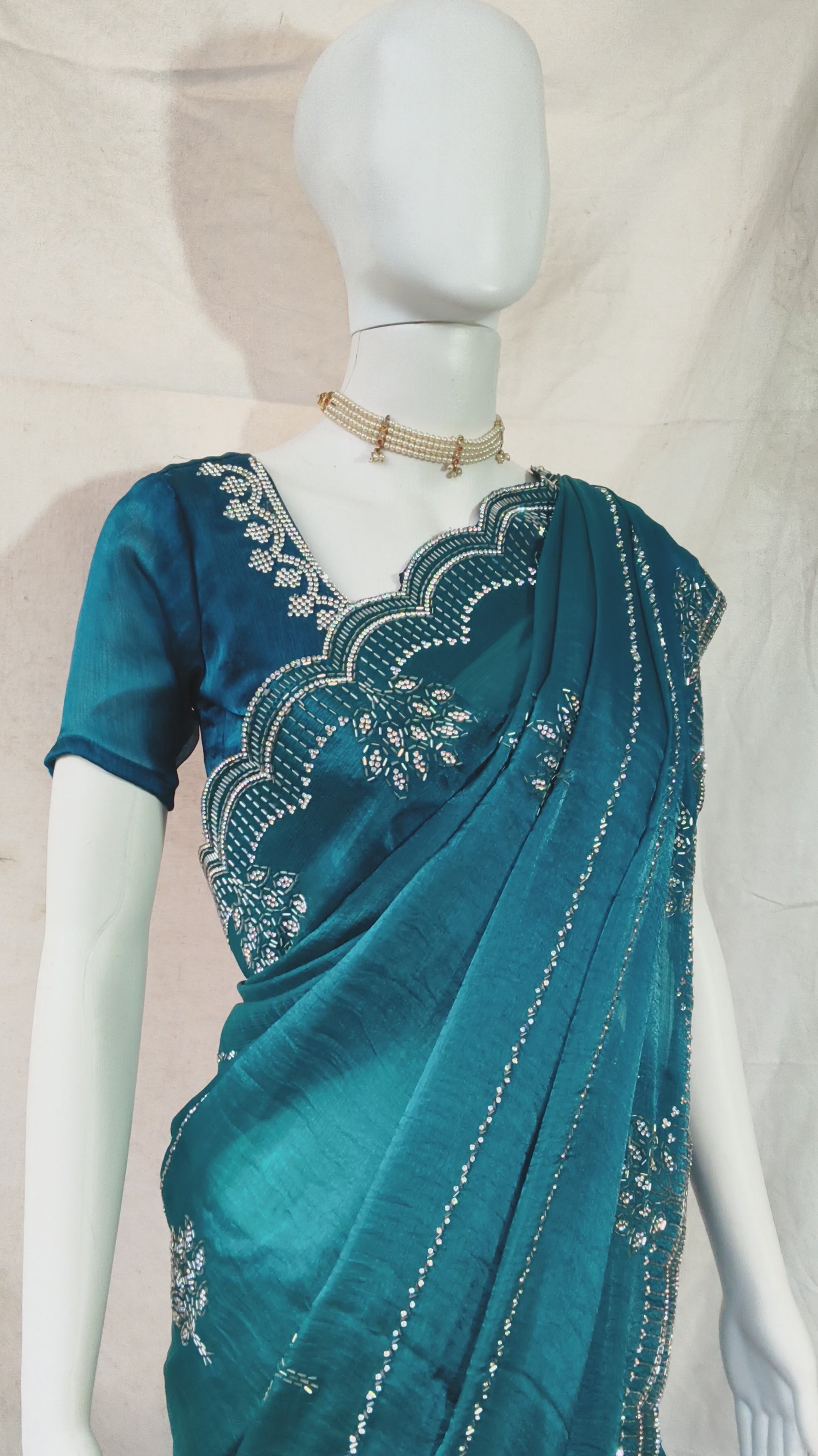 Silk Wedding Blue Zarkhan Diamond Stone Cut Work Saree